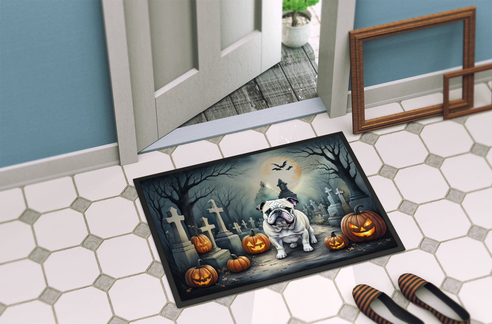 Doormat featuring breed specific English Bulldog artwork. Celebrate Halloween with this Halloween Doormat. Welcome your guests in style with our Artwork Door Mat, designed to withstand almost any weather condition. This mat, measuring approximately 18 by 27 inches, is held together by durable black binding tape. Its top layer, composed of polyester felt, is dyed with the eye-catching image you see on the mat. A few layers below provide the mat with stability, while its rubber bottom is stamped to help prevent slipping and ensures safety. Our mat works wonderfully as both an indoor or outdoor door mat. For cleaning, simply hose it off with water or use a power washer - no need for any cleaner that produces suds. Avoid scrubbing with a brush, instead, opt for the vacuum on floor setting. Designed manufactured and printed in the USA, this mat is a perfect addition to your porch, outdoor kitchen, entryway, or any indoor space. Its unique design makes it a charming decorative rug that greets your guests and adds a stylish touch to your home decor.