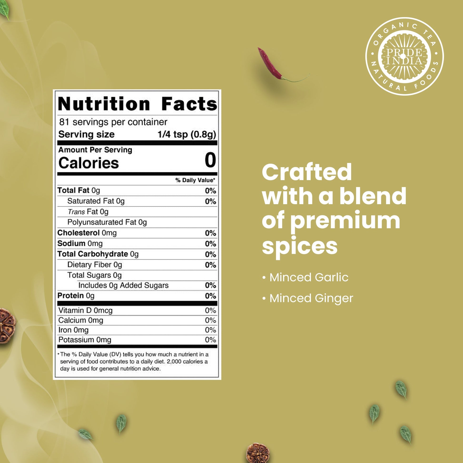 SIZZLE & SPICE, TASTE PARADISE: A flavorful embrace of aromatic ginger and pungent garlic, this blend ignites your taste buds with a comforting warmth. Its fiery undertones and zesty notes infuse every dish with a tantalizing kick, transforming ordinary meals into extraordinary culinary adventures. Elevate your cooking with the bold, balanced, and irresistibly aromatic character of this seasoning. A culinary delight that leaves a lingering impression of heat and zest.